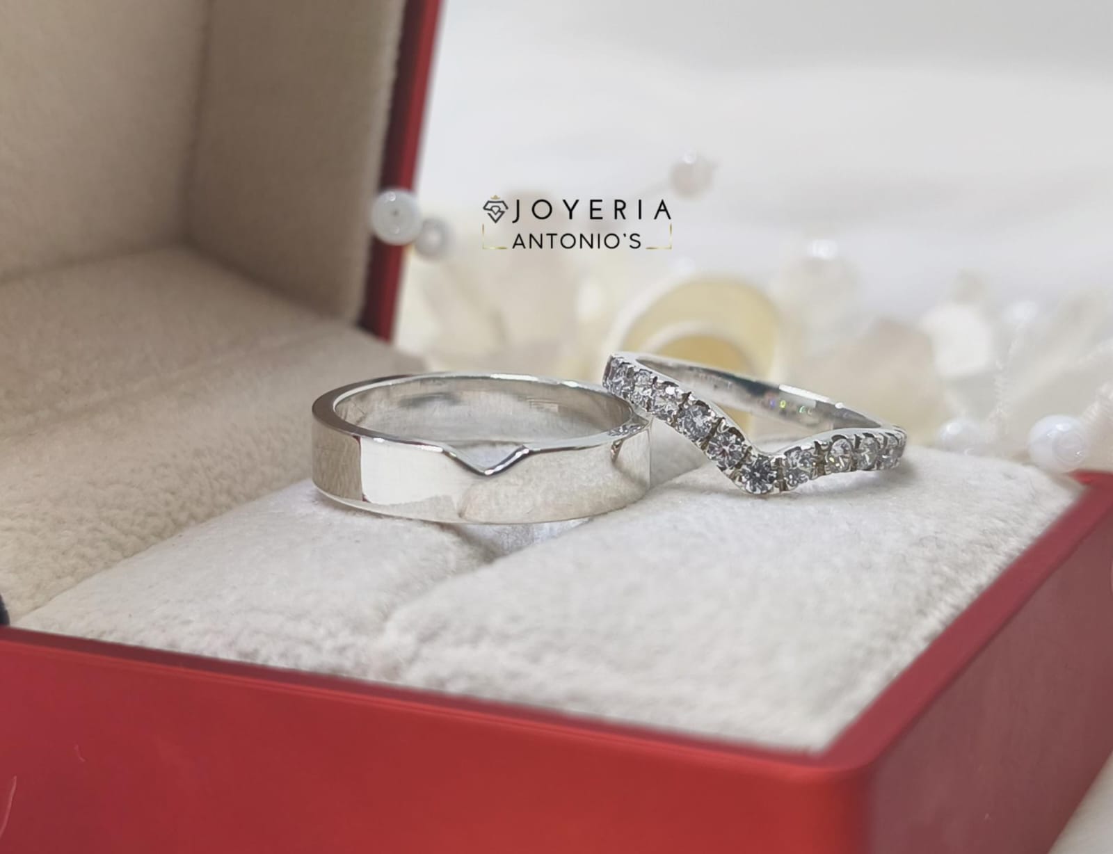 Par de aros matrimoniales elaborados en plata 950,  el diseño de la dama con incrustaciones de piedras moissanitas.